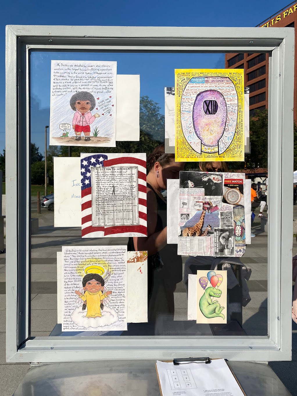The project culminated with an impactful public art installation at the People’s Plaza at Independence Historic National Park. Within the exhibition, the effect of the exception clause was narrated through drawings, paintings, and collages by currently incarcerated artists. Alongside these individual perspectives was a diagrammatic mural outlining the larger system of prison labor. Visitors could listen to audio recordings played through prison phone booths; the recordings stitched together a narrative of economic punishment that affects not just the incarcerated individuals, but their families and communities as well. Several public programs that elaborated on the core themes were scheduled throughout the duration of the exhibition, including a film screening of Angola Do You Hear Us? Voices from a Plantation Prison (Dir: Cinque Northern, 2022).